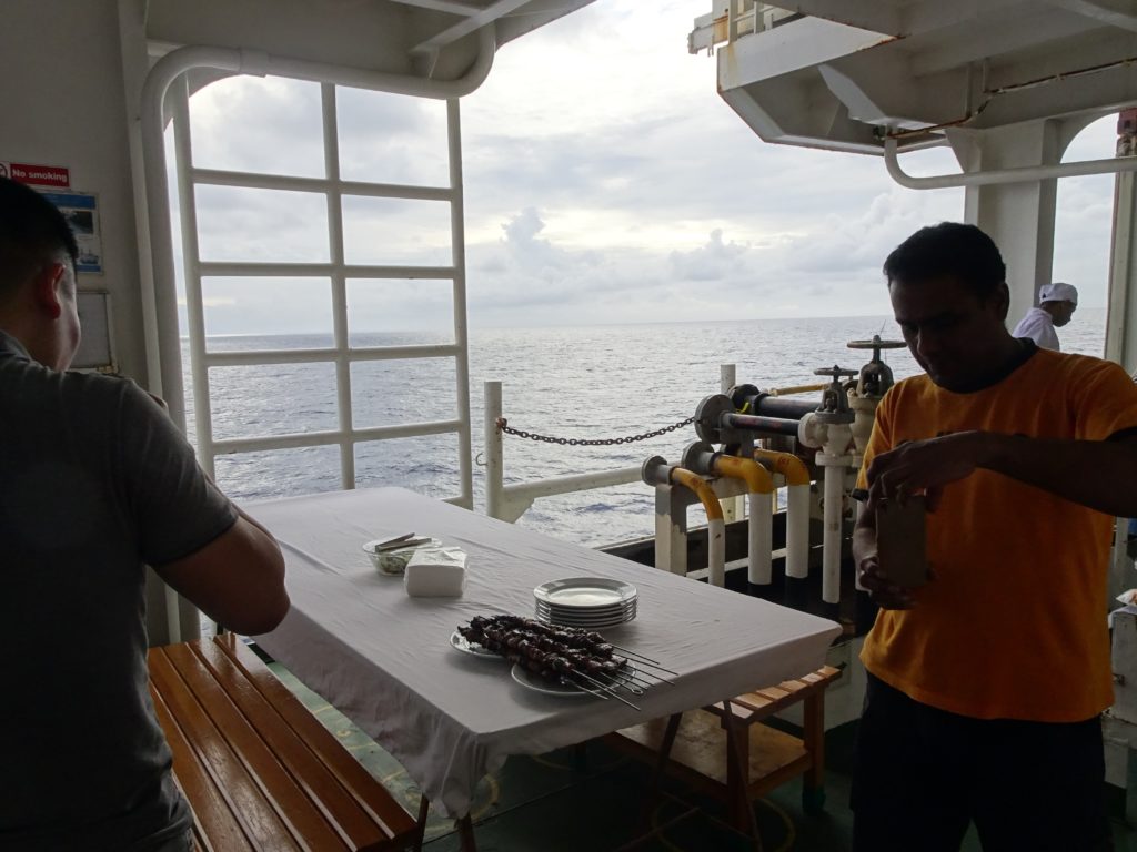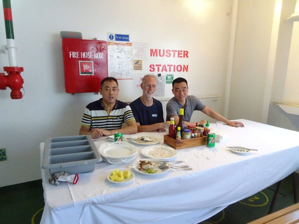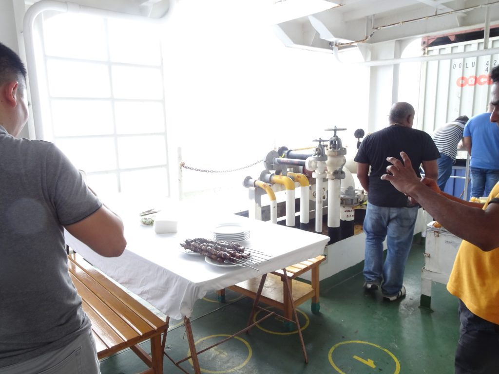When I asked something and understood the answer, then I knew the captain had not understood my question, when he said something I tried to guess by the melody of the sentence, where a good moment for nodding or smiling could be. The loud music was his own playlist and he skipped all Chinese songs although some started more promising than many of the more international songs were. First, you saw the whole crew around the grille but soon the Sri Lankans went inside in the crew’s recreation room and the Chinese still were outside. The captain said something about beef, but I am not sure if the segregation is based on meat. At 19:00, everything was over again and two times I got the explanation that there is no beer allowed and so, people don’t sit longer together than necessary….
