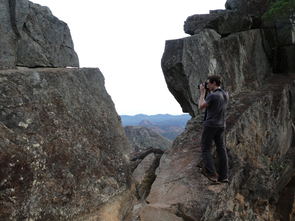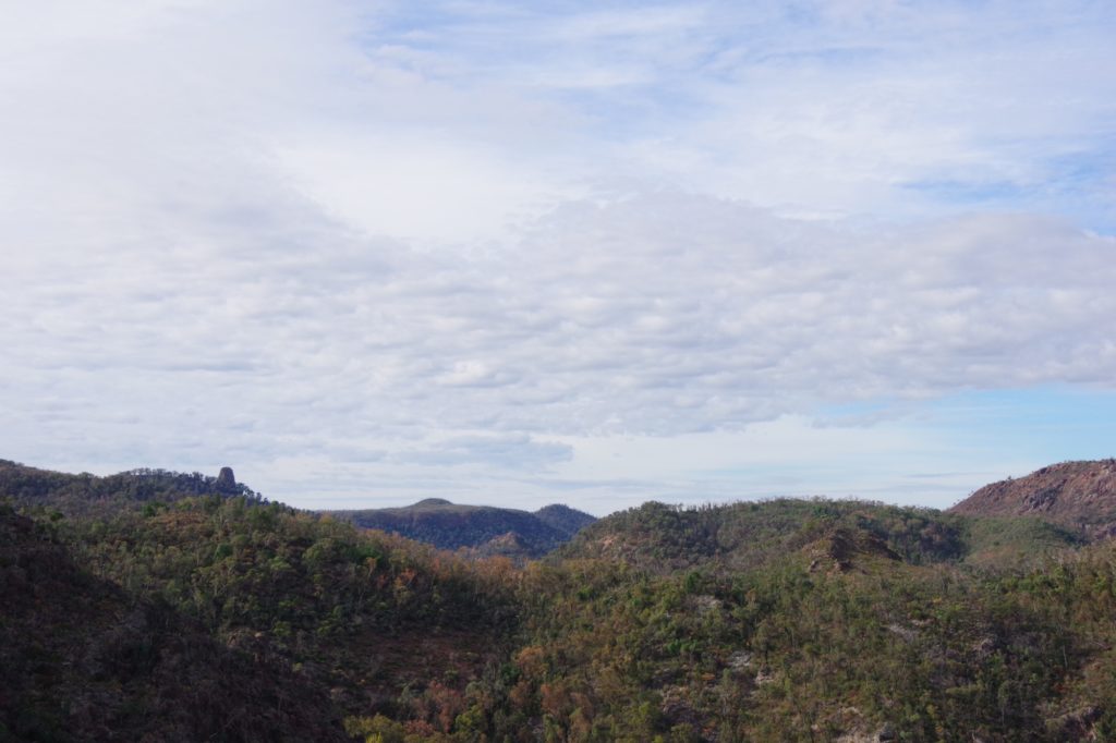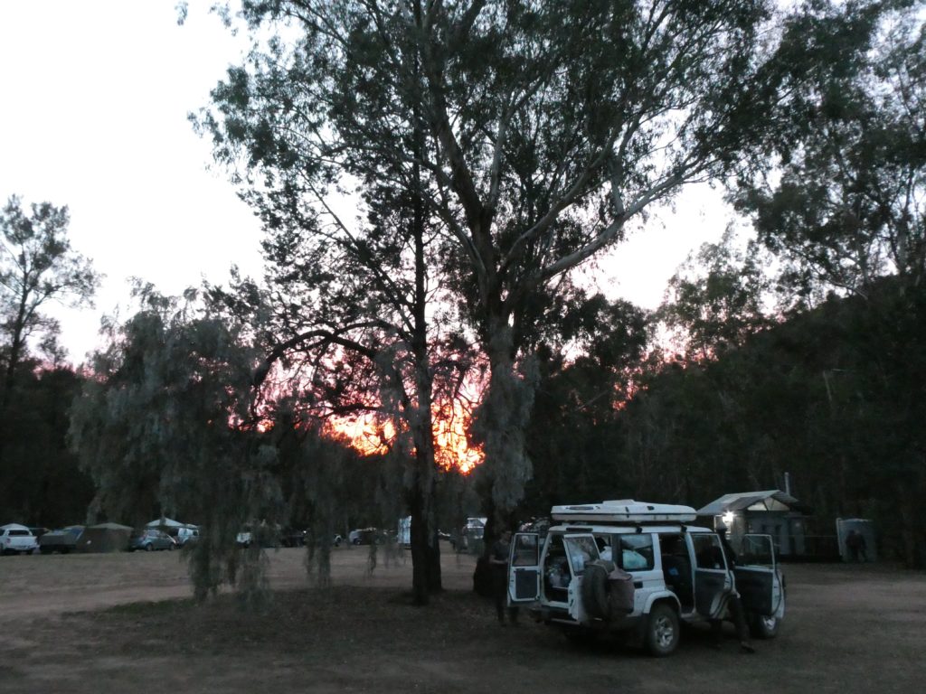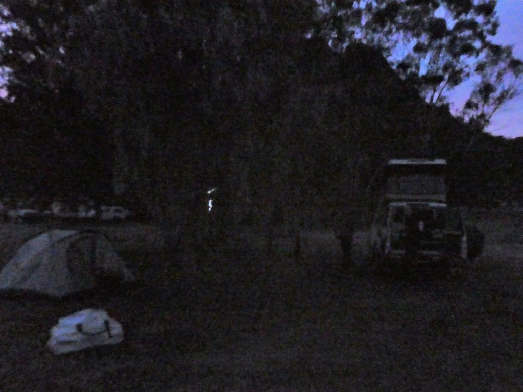 Then the last long drive of this trip started with a stop at the Wollomombi falls. They were dry and the outlook was closed because of construction work. We went on to the campsite of the day in the New England National Park. First it slowly became greener, and the more we went up the more it became wet and cooler. We managed to set up the tent in a dry place in the Thungutti camping area before it became dark