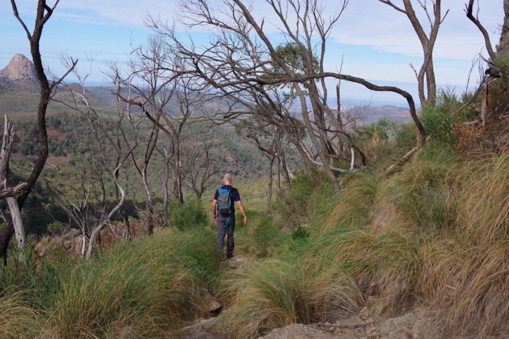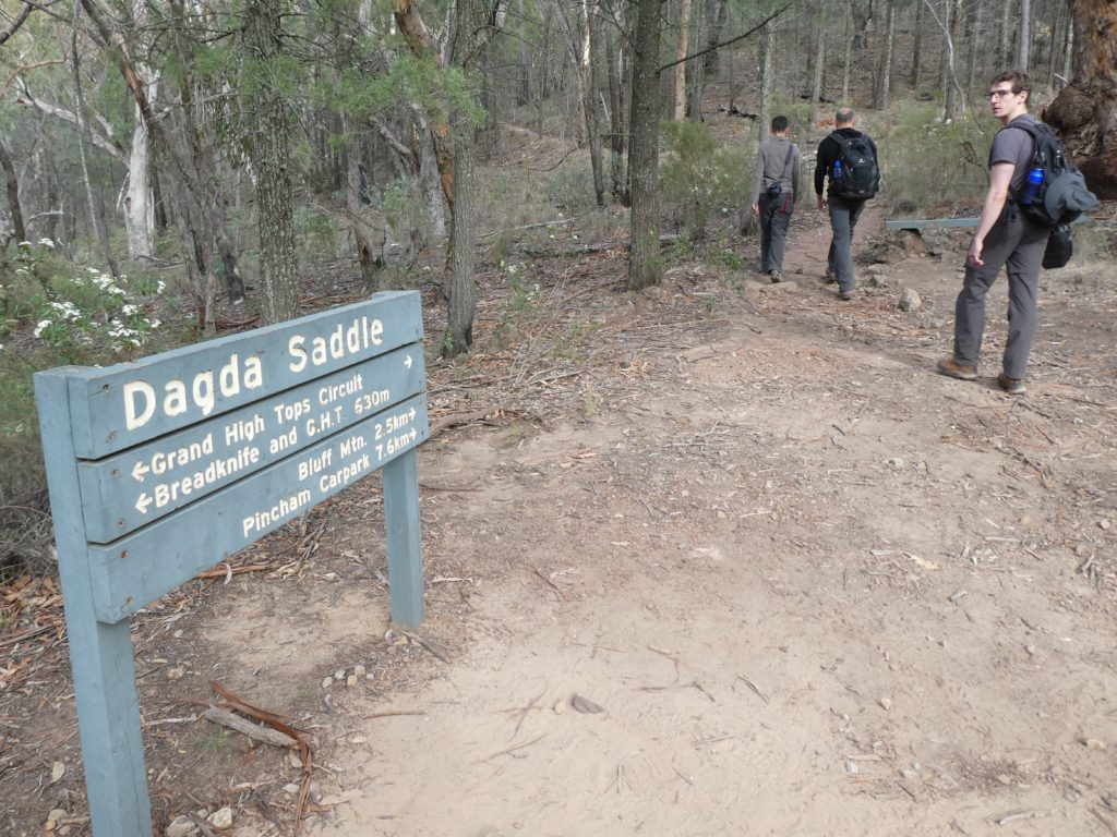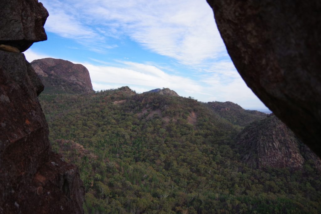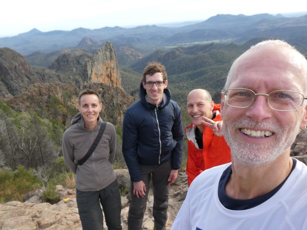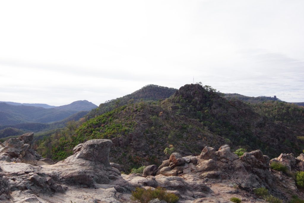 and the other M’s joined one after the other, so we left at 6:20 and started a 4 hours hike on the Grand High Tops Circuit. On top, there are some iconic rocks like the bread-knife peak, and you get a great view in all directions. We found a place without wind to have a snack before going down.