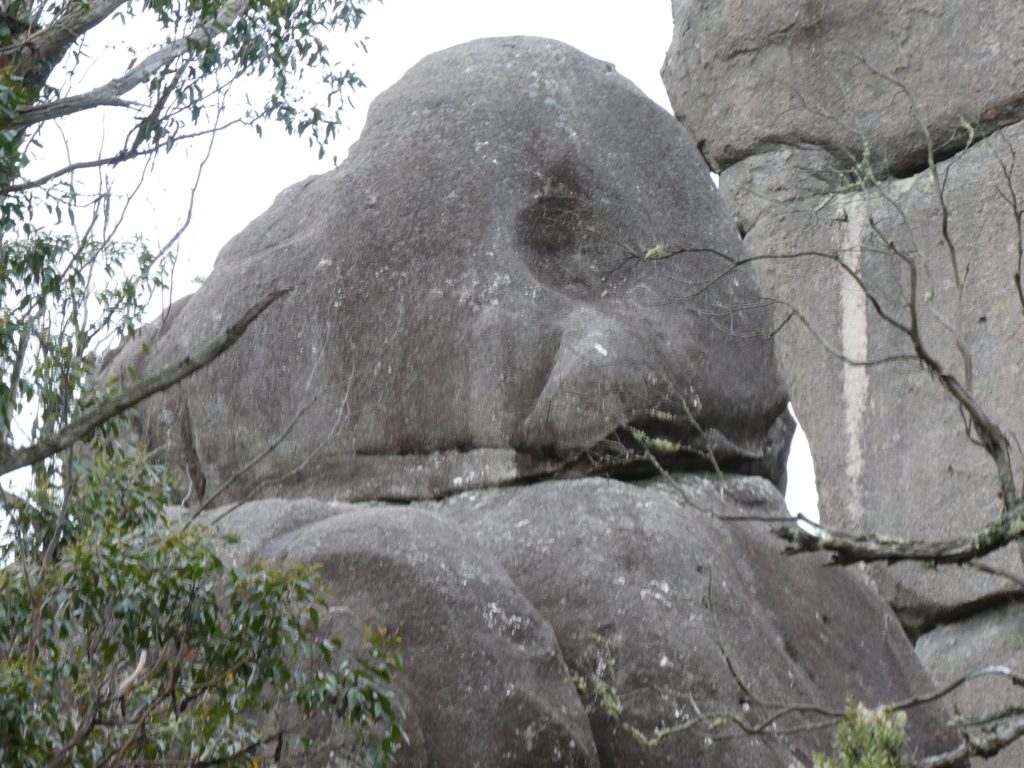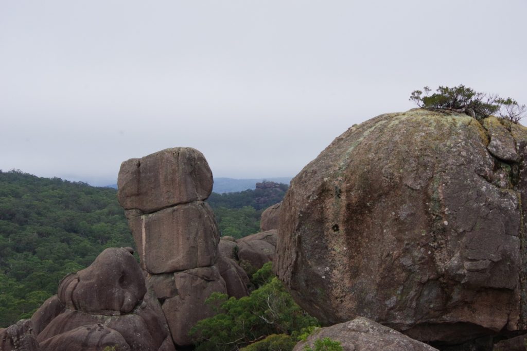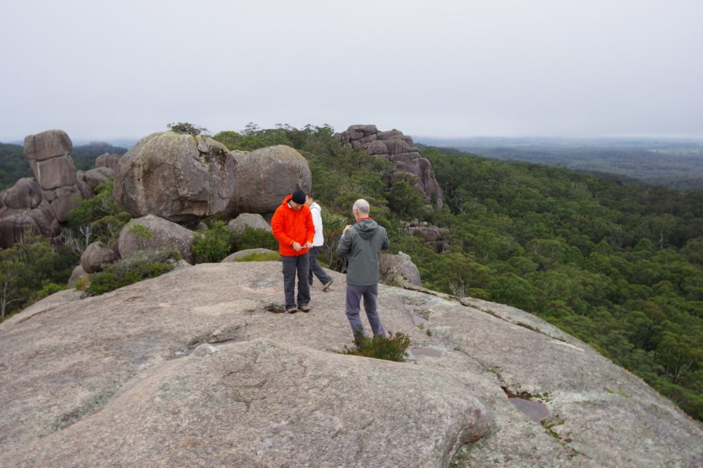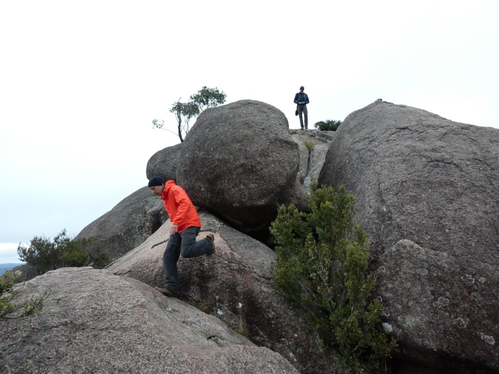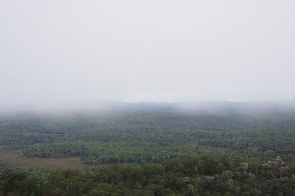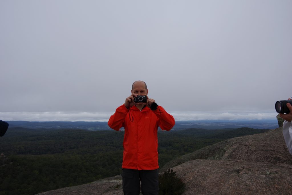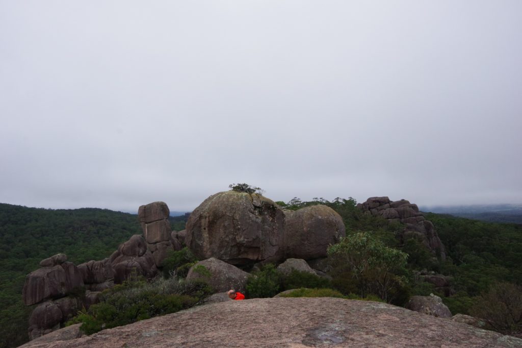 In the nearby village Ebor we had a small lunch with scones and veggie burgers and tried to find a place to refill the gas bottle but couldn’t find, so we went on to the next camping place on our list, the Barokee rest area, and pitched the tent, before we started the walk in Cathedral Rock National Park in a flat and pleasant area. After a while it became more and more challenging, in the end especially for people with fear of heights, like 3 of us (2xM+1D). But we all wanted to get to the top, being well aware of the difficulties ahead of us when it is about getting down again. On top, we shortly enjoyed the view, before bravely finding our way down.
