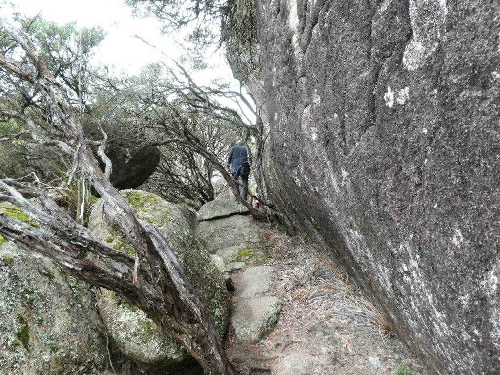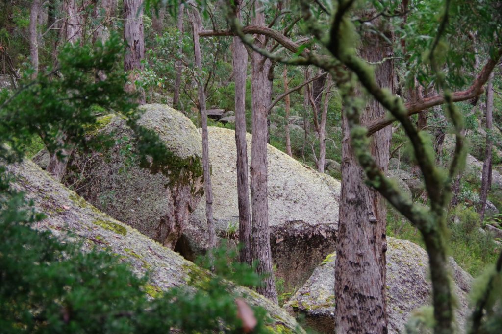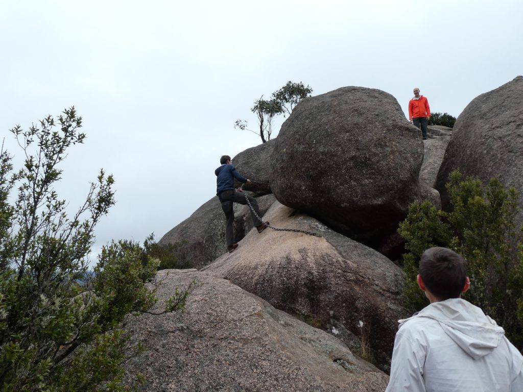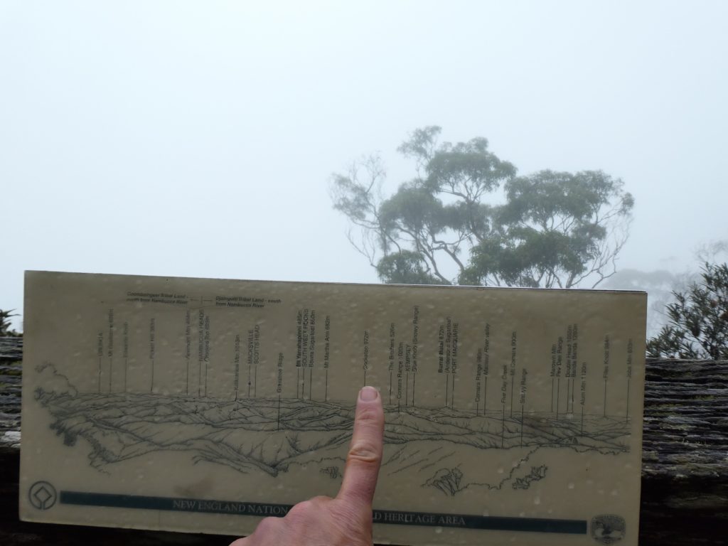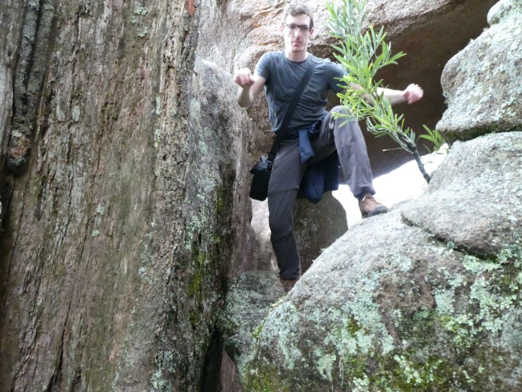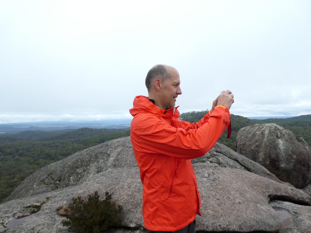 In the nearby village Ebor we had a small lunch with scones and veggie burgers and tried to find a place to refill the gas bottle but couldn’t find, so we went on to the next camping place on our list, the Barokee rest area, and pitched the tent, before we started the walk in Cathedral Rock National Park in a flat and pleasant area. After a while it became more and more challenging, in the end especially for people with fear of heights, like 3 of us (2xM+1D). But we all wanted to get to the top, being well aware of the difficulties ahead of us when it is about getting down again. On top, we shortly enjoyed the view, before bravely finding our way down.