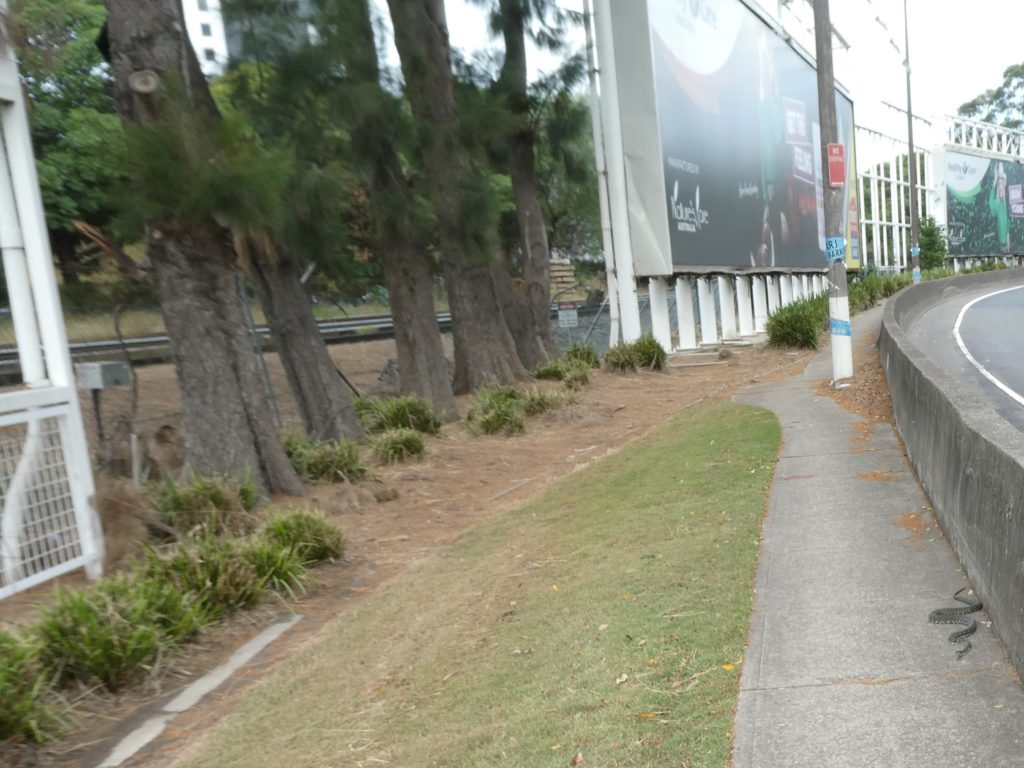 I walked home and nearly ran into a snake that lay on the sidewalk.