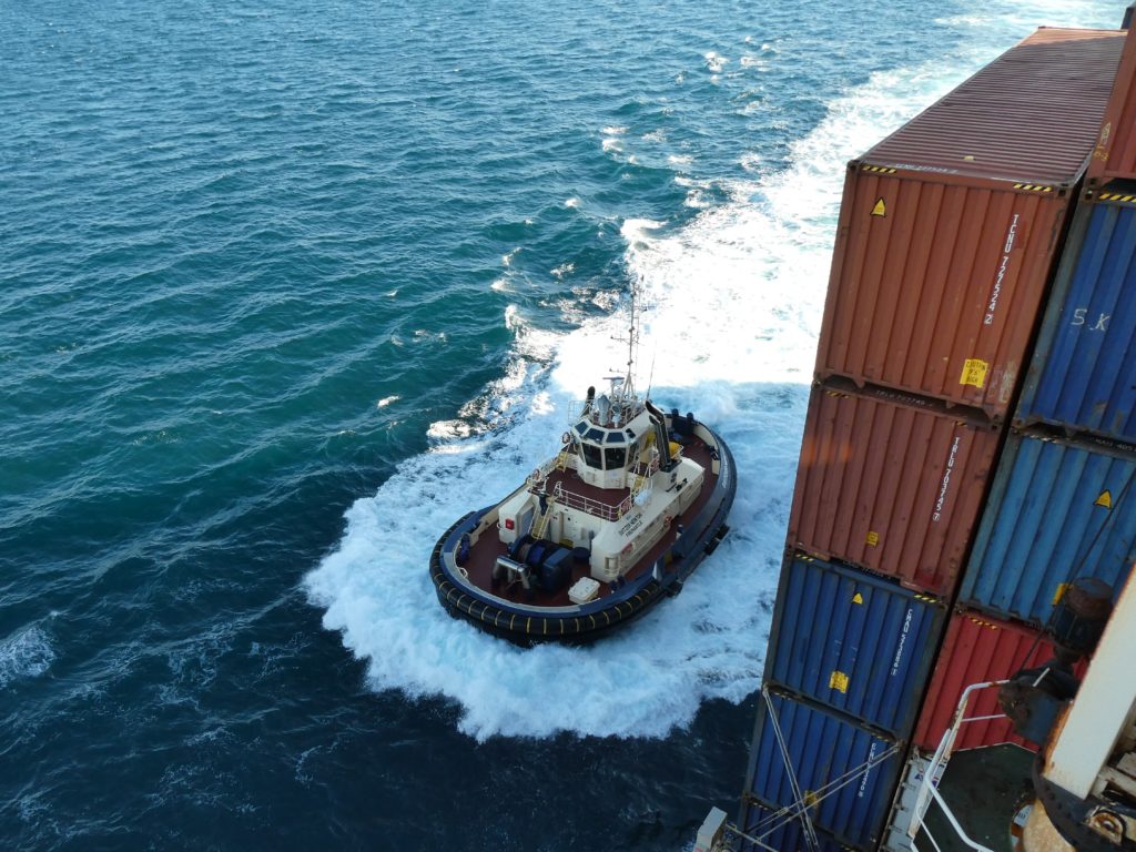 the tugboat comes and gets a rope (but it pushed not pulling)
