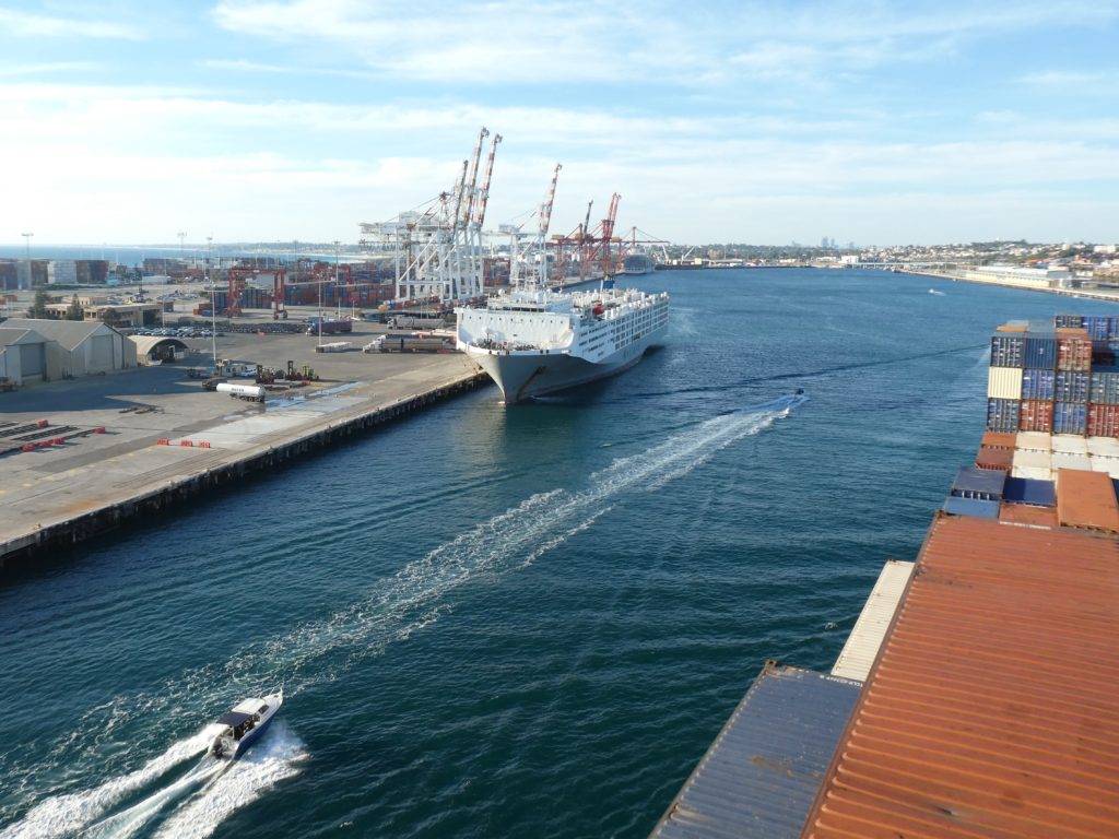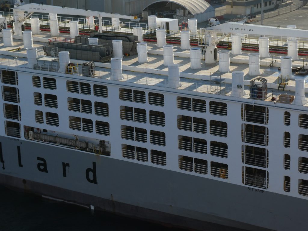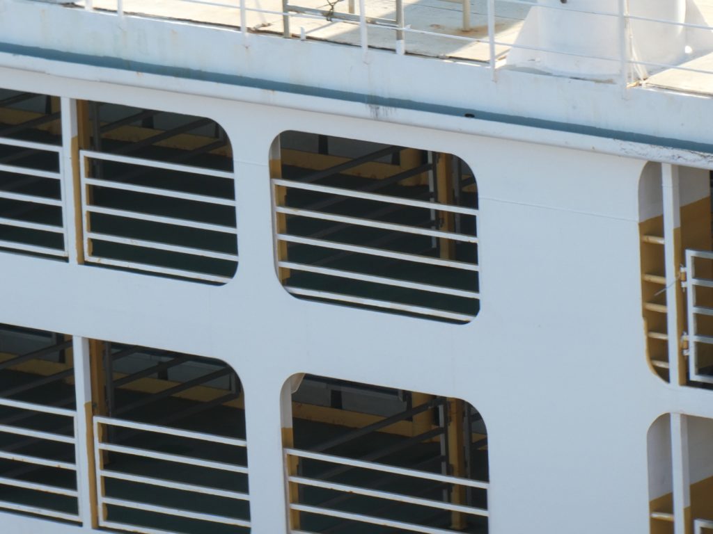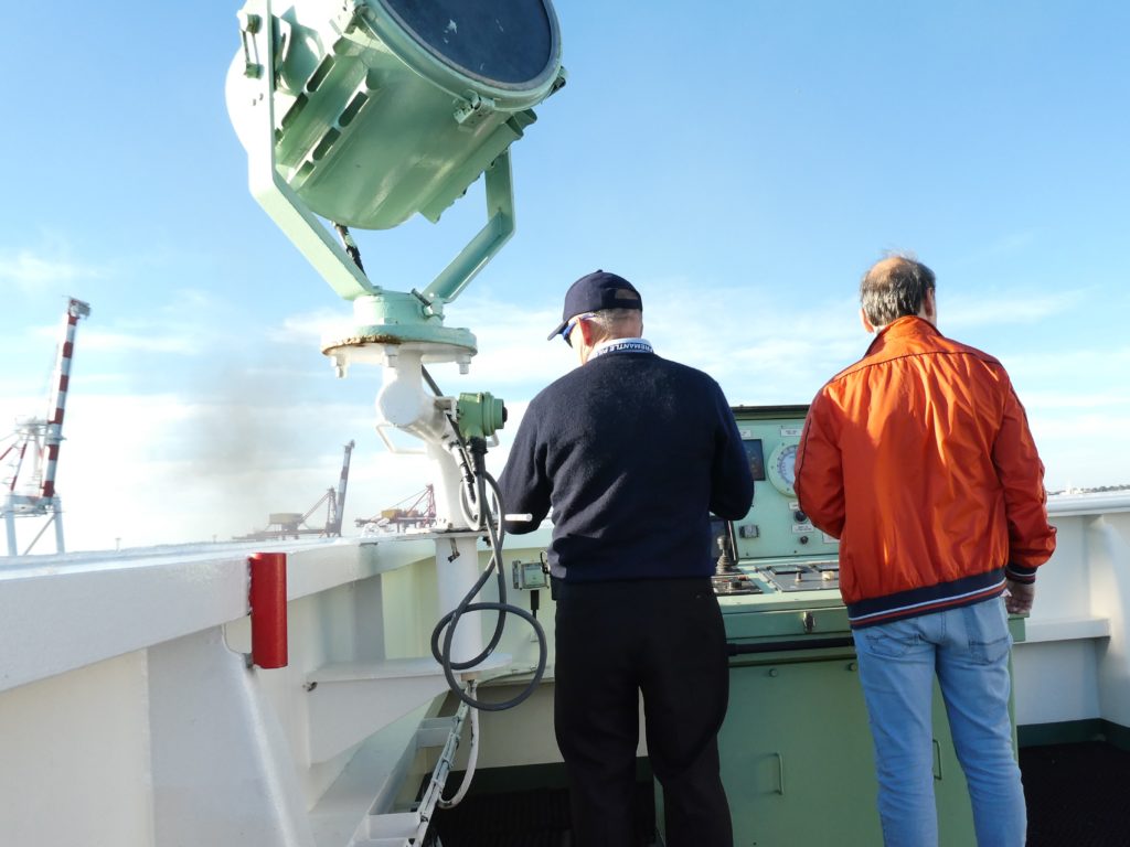 The captain, btw the first one who didn’t change to uniform when arriving at the port, had no problem when I was on the bridge, inside or outside, and so I could see some new details of landing but also a dolphin!