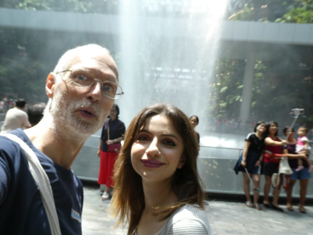 In the morning, I finished most of my digital work, packed my bags and moved to the originally booked room, that was a bit smaller, but with one and bigger bed and without a fridge, that made it standard compared to “deluxe”. The I went to the MRT, topped up the card Lulu had given to me and withdrew money. Both worked well. At the airport, I bought a SIM card, but for unknown reason my normal phone could not work with the SIM card, only my spare part phone. Hasmik arrived at 13:00 and we had some time for sightseeing in the Changi airport with the biggest indoor waterfall of the world.