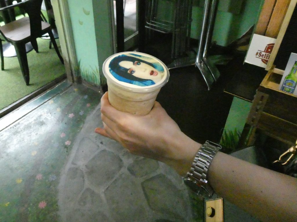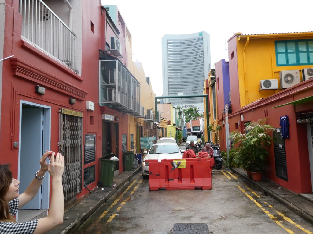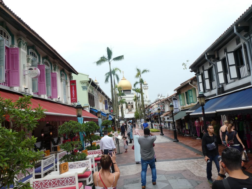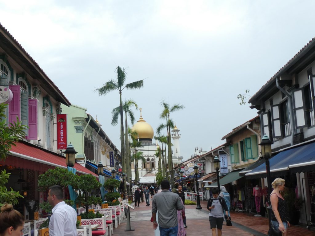 Then we went back to Bugis to meet Lulu for lunch. When we met, it was heavily raining, and the umbrellas only helped a bit for the head, but shoes and legs were completely wet. Lulu brought us to a vegetarian food court and while she and Hasmik at some Indian vegetarian dishes, I finally could finish my food, eating fat roasted ham in a Vegetarian restaurant. As a dessert, we took a cup of passion fruit pulp and a lavender/taro ice cream. Meanwhile the rain had stopped, and we could go to the Sultan mosque and the beautiful small streets nearby. We had another dessert, Hasmik got a “selfie-coffee” with froth showing her picture and together, we shared two small pieces of cake/tarte, before Lulu had to go. Hasmik and I then went to another place with wifi, so she could connect to facebook. The problem was that I forgot to pay when we were about to leave, because in most cases so far paying was in advance and now the waiter had to run to the street to bring me back. Let’s say embarrassing, the more, as we had been talking so friendly to the staff and had asked for tips were to go next sightseeing tour.