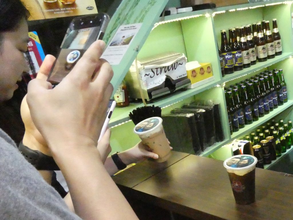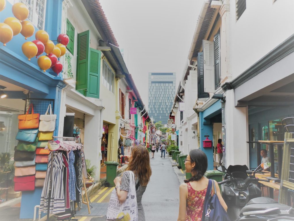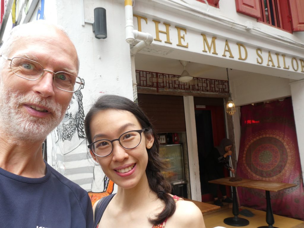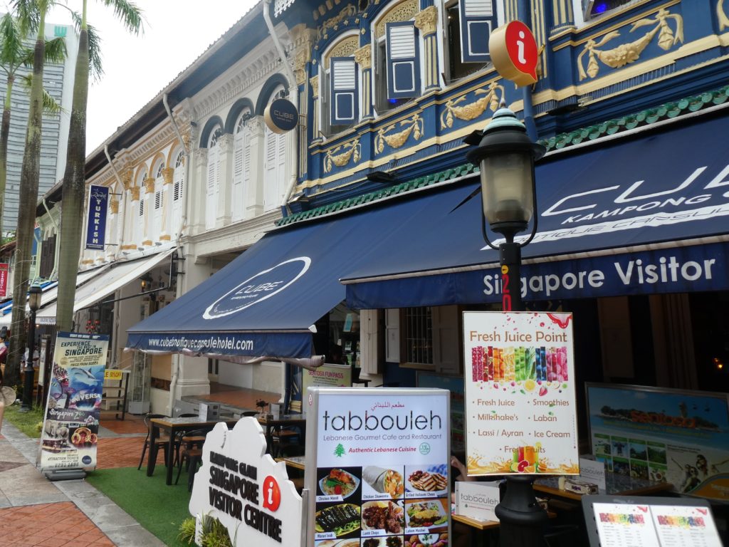 Then we went back to Bugis to meet Lulu for lunch. When we met, it was heavily raining, and the umbrellas only helped a bit for the head, but shoes and legs were completely wet. Lulu brought us to a vegetarian food court and while she and Hasmik at some Indian vegetarian dishes, I finally could finish my food, eating fat roasted ham in a Vegetarian restaurant. As a dessert, we took a cup of passion fruit pulp and a lavender/taro ice cream. Meanwhile the rain had stopped, and we could go to the Sultan mosque and the beautiful small streets nearby. We had another dessert, Hasmik got a “selfie-coffee” with froth showing her picture and together, we shared two small pieces of cake/tarte, before Lulu had to go. Hasmik and I then went to another place with wifi, so she could connect to facebook. The problem was that I forgot to pay when we were about to leave, because in most cases so far paying was in advance and now the waiter had to run to the street to bring me back. Let’s say embarrassing, the more, as we had been talking so friendly to the staff and had asked for tips were to go next sightseeing tour.