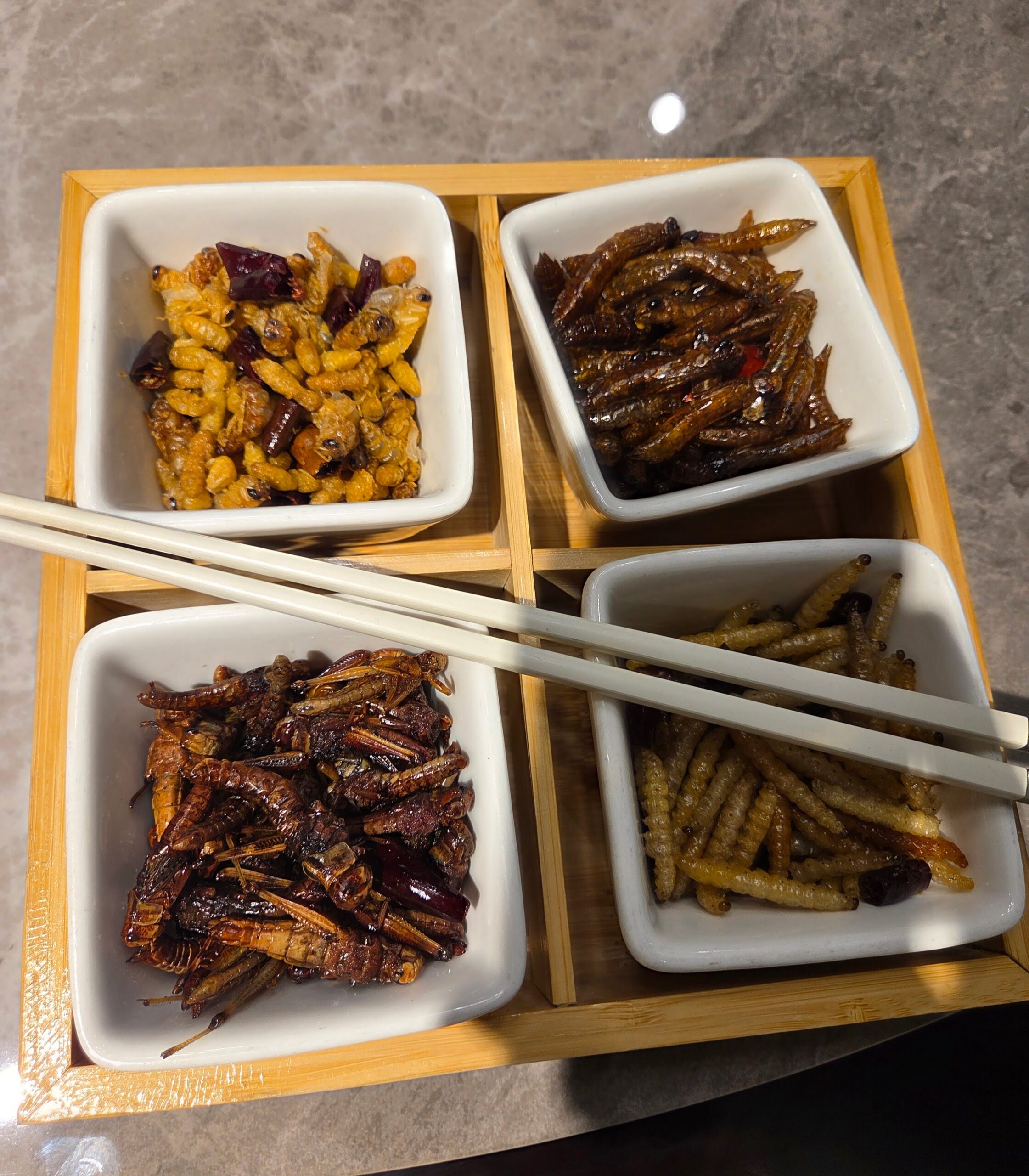 There was a wide selection of delicious food, from delicious tofu and a sturgeon (the highlight) to insects.