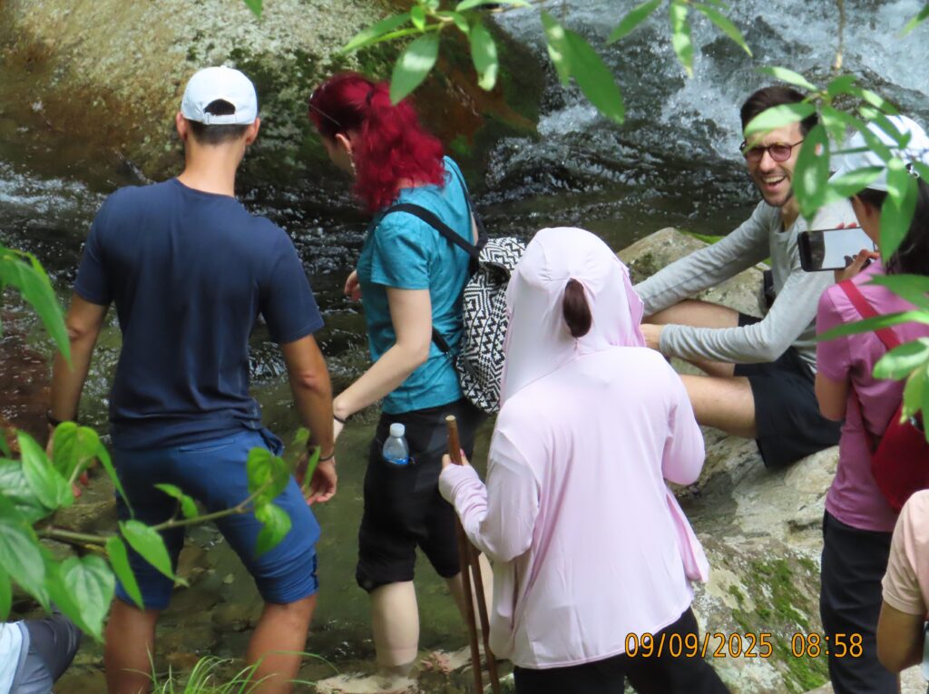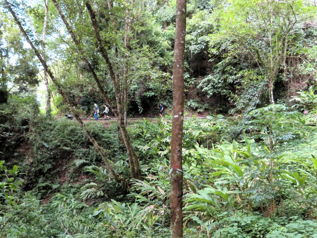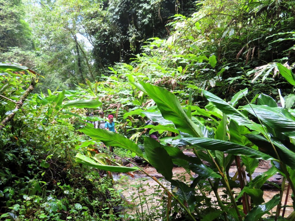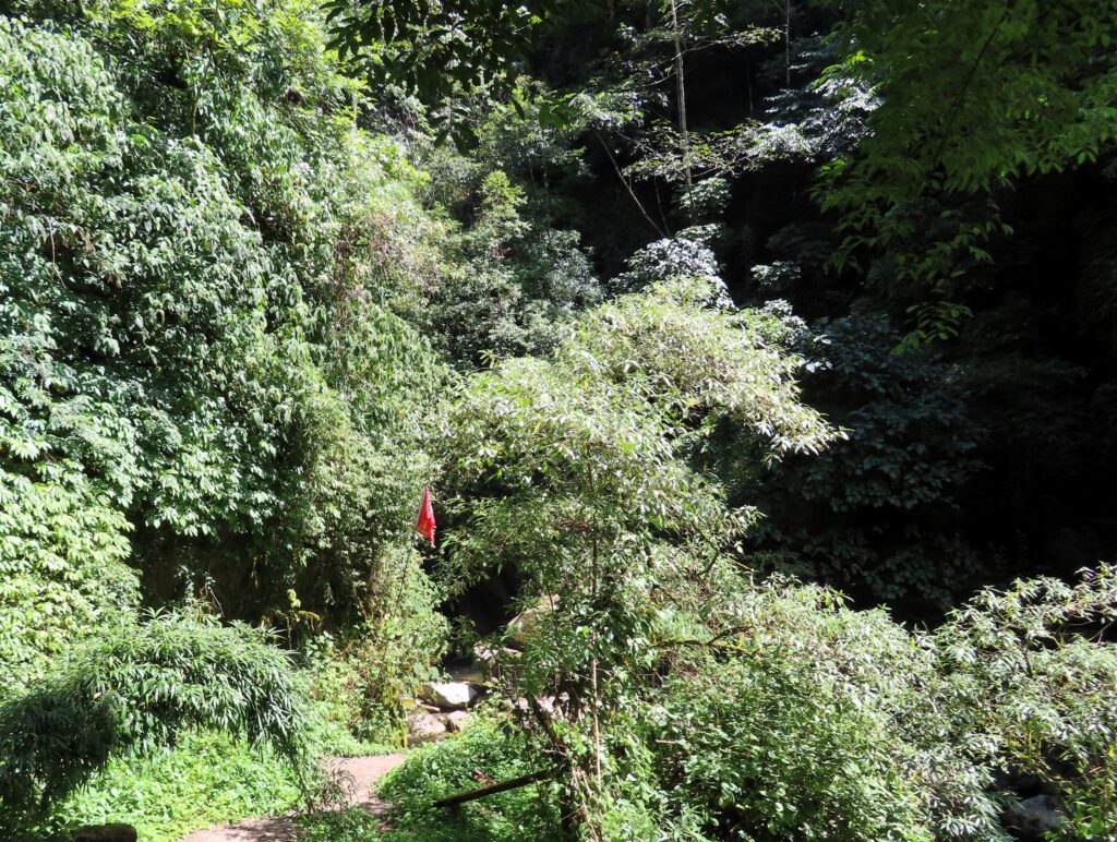 We met two men and a woman who were accompanying us. We grabbed the those rain jackets, bamboo walking poles, water, and a lunch box, and set off. It only took a few minutes before we were in a forest near a stream or small river, and the landscape transformed into a gorge.