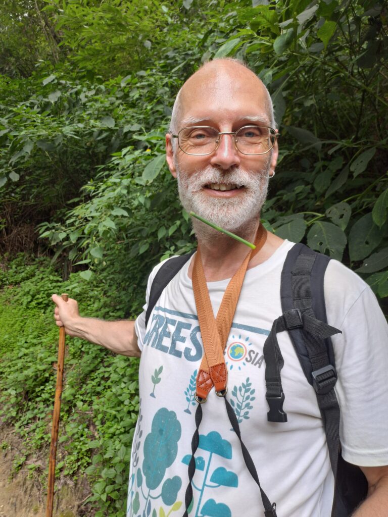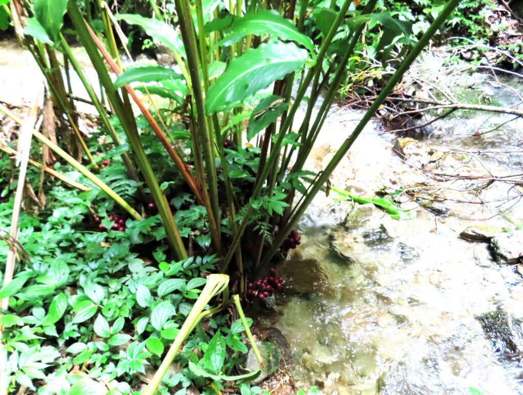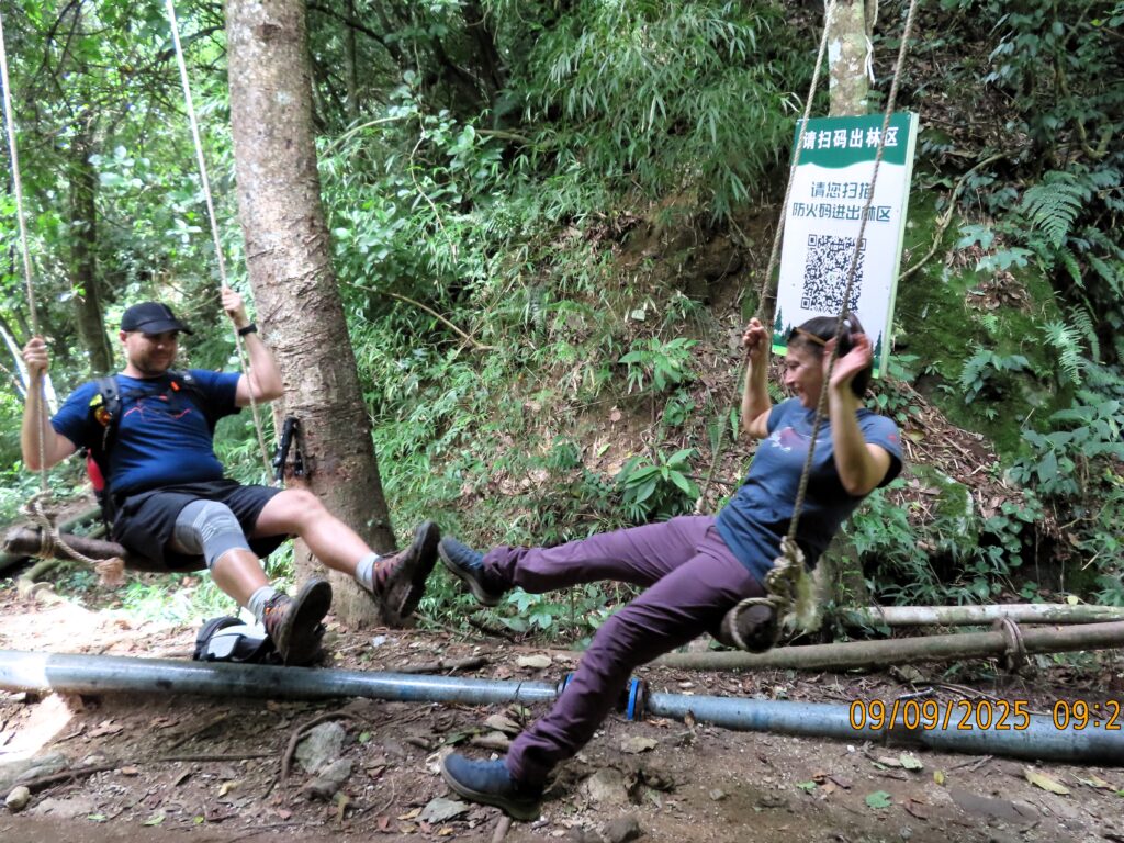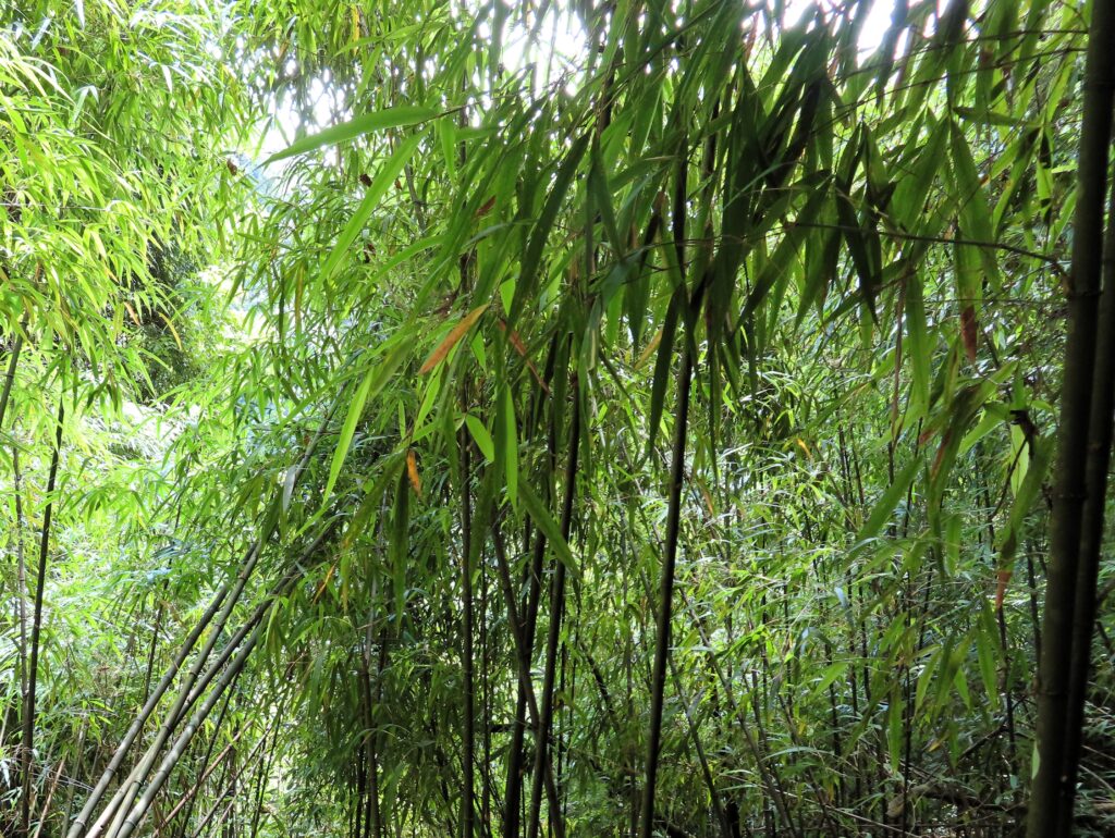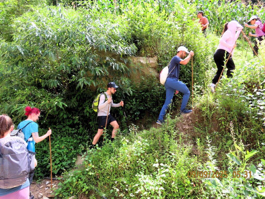 We met two men and a woman who were accompanying us. We grabbed the those rain jackets, bamboo walking poles, water, and a lunch box, and set off. It only took a few minutes before we were in a forest near a stream or small river, and the landscape transformed into a gorge.
