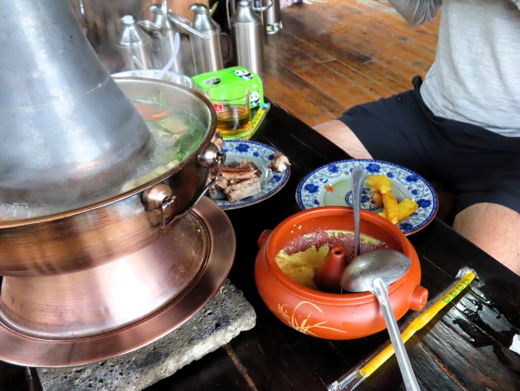 For the sake of simplicity, I’ll call part of it a hot pot version (with charcoal heating), surrounded by vegetables and a new specialty: steamed egg, an egg scrambled with twice the amount of water in a special bowl (similar to a Bundt pan).