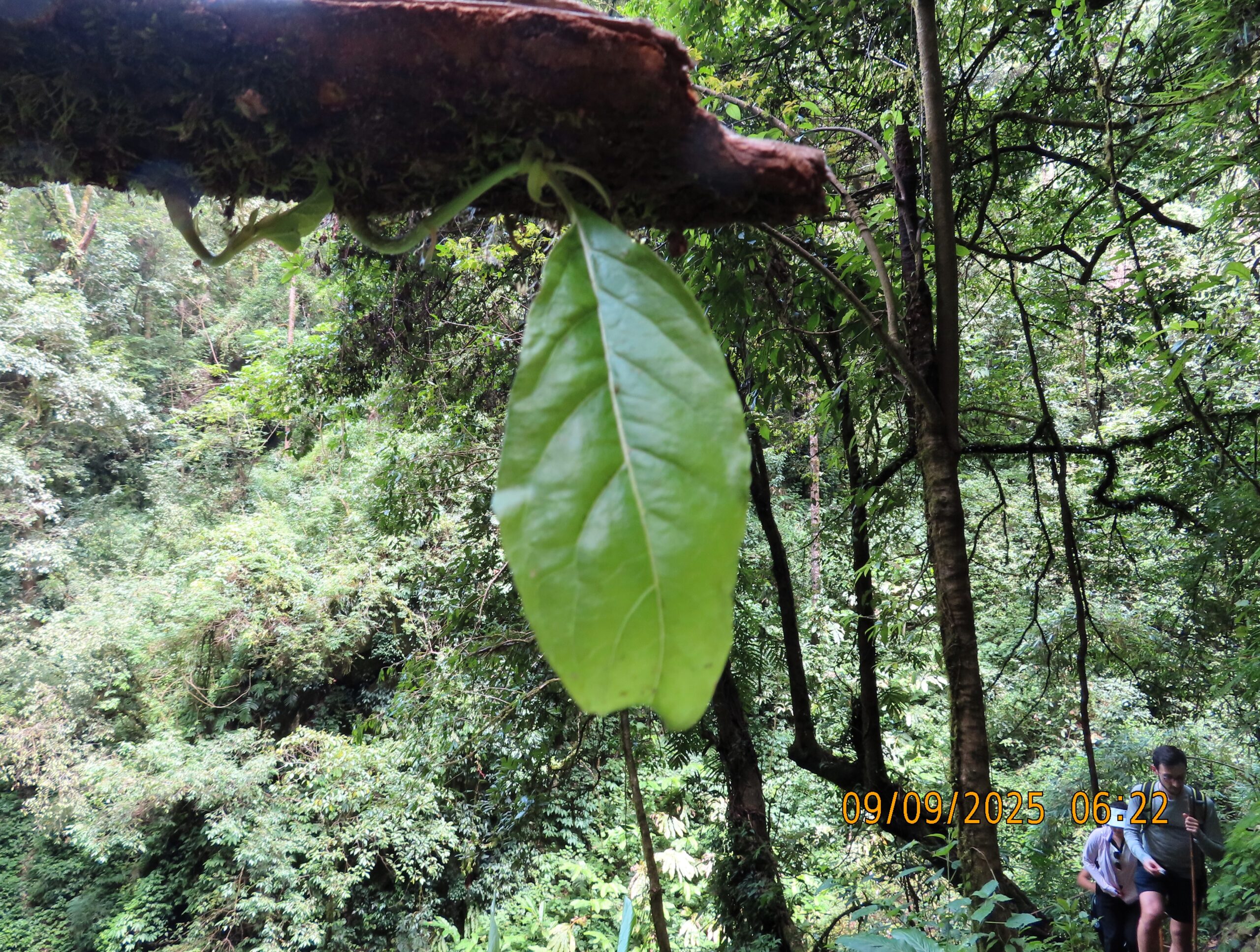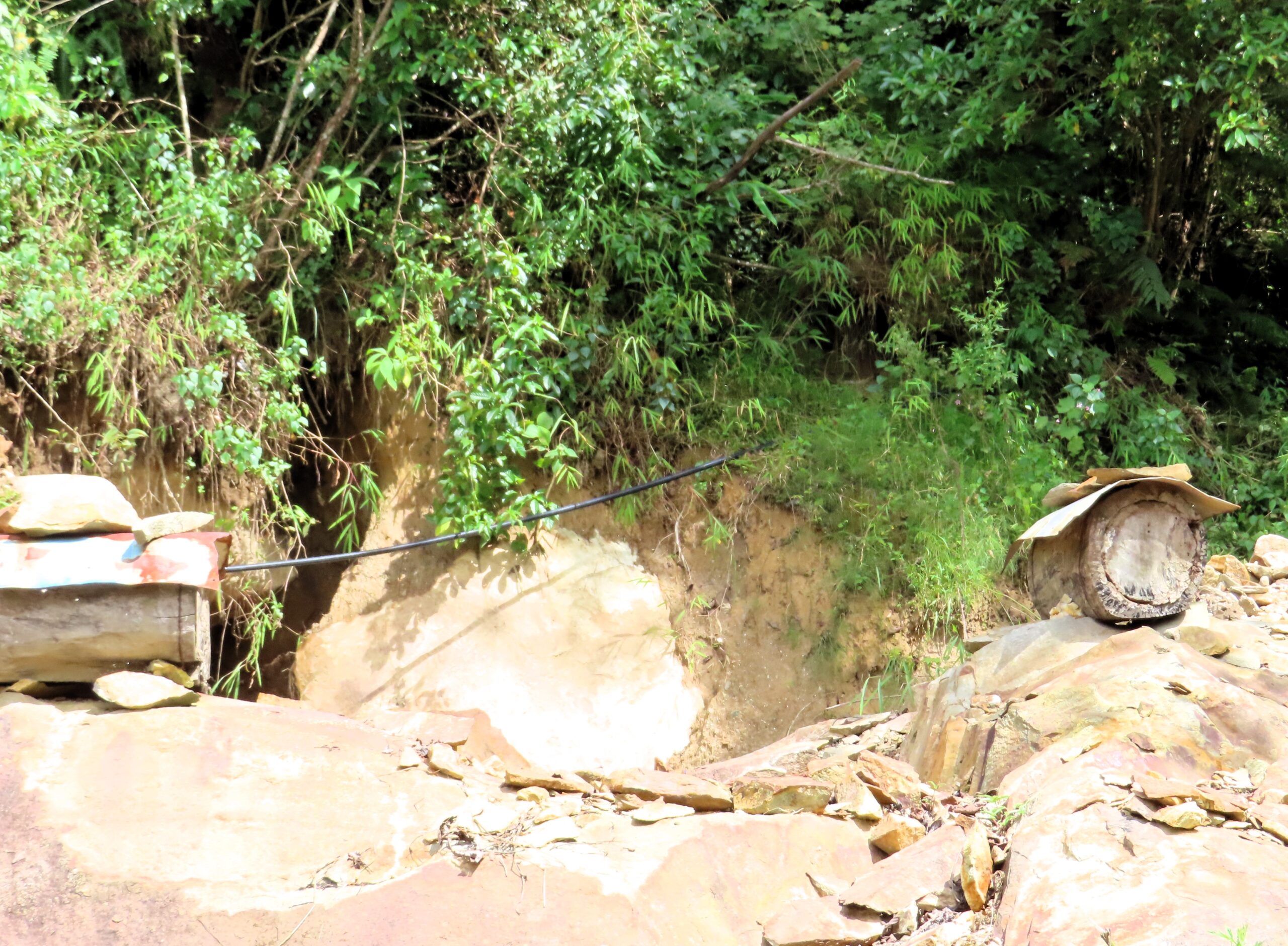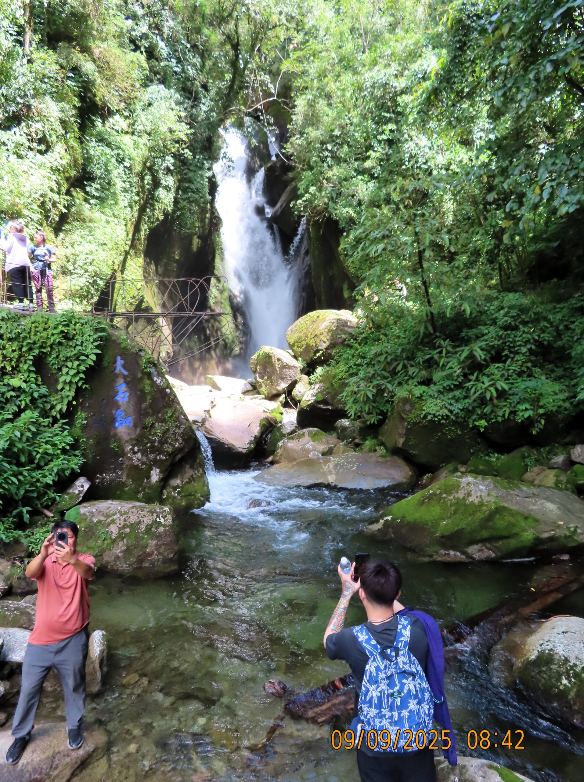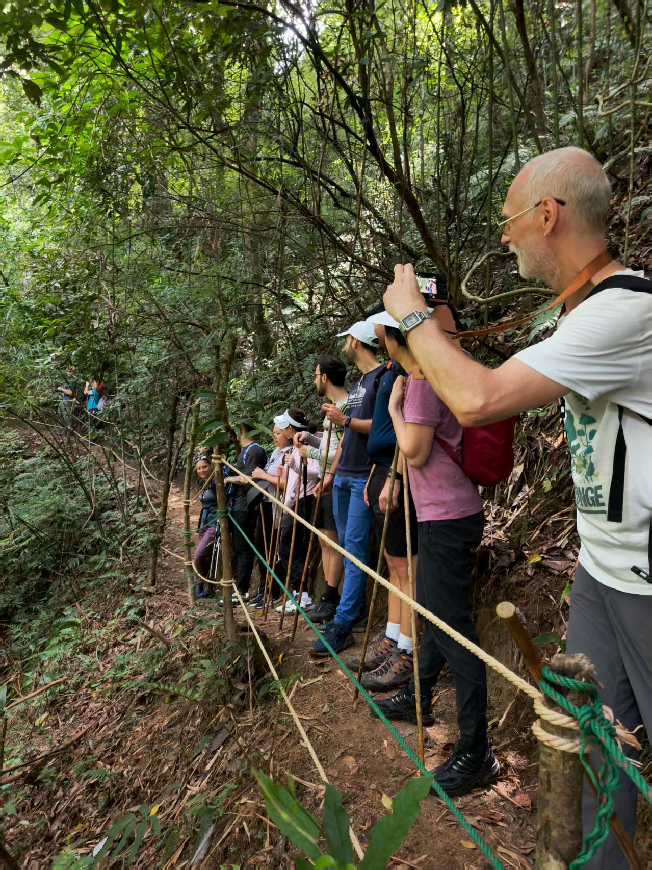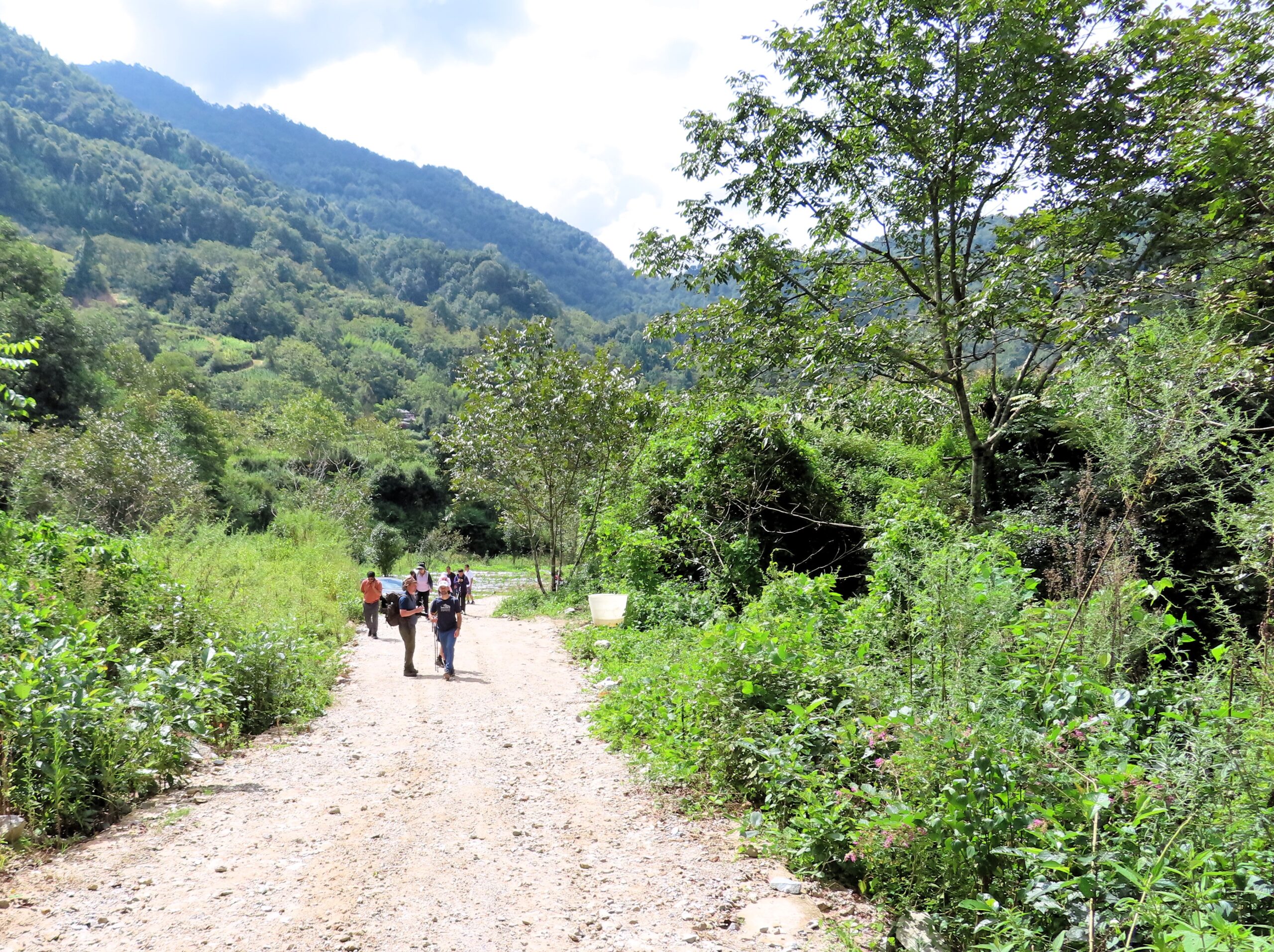 We met two men and a woman who were accompanying us. We grabbed the those rain jackets, bamboo walking poles, water, and a lunch box, and set off. It only took a few minutes before we were in a forest near a stream or small river, and the landscape transformed into a gorge.