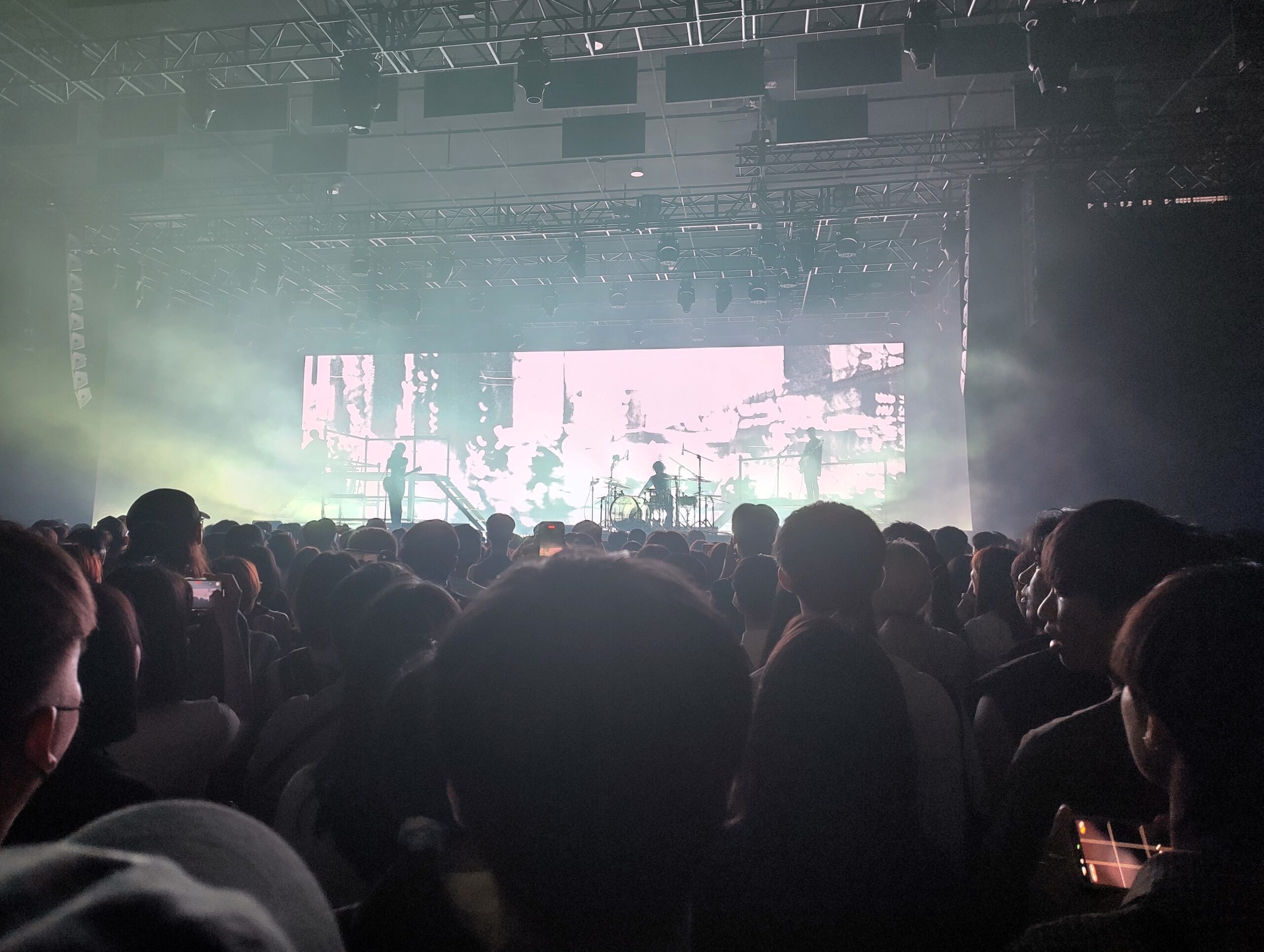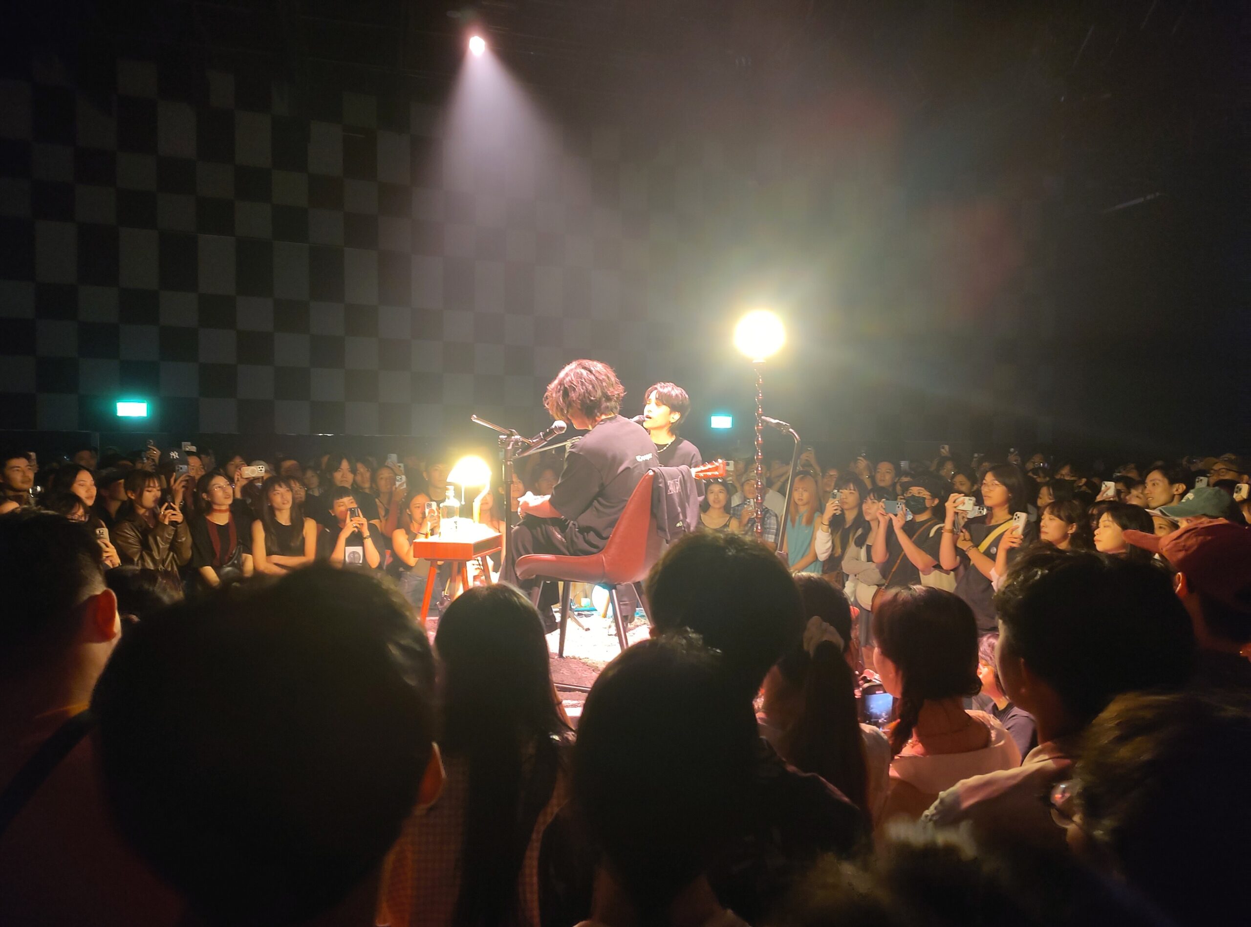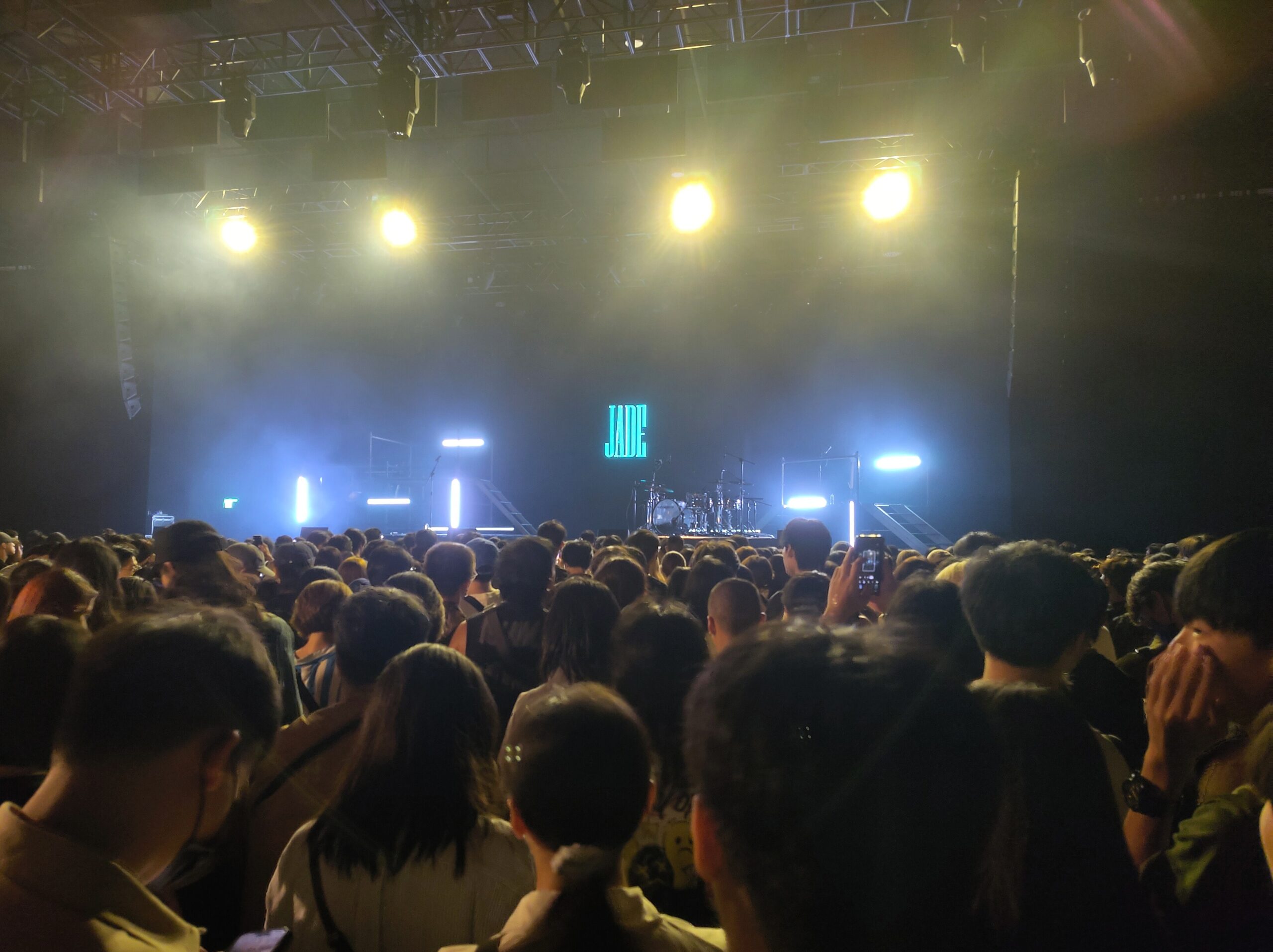 Time flew by, and at 5:00, Glen played another round of basketball tournaments. The other three went home, and Li and I met two other good friends of hers, Ice and Yi Lun, and went to a concert of “Jade”. (“Formed in 2018, Taiwanese duo JADE is known for its polished indie rock tracks with big choruses, catchy hooks, and great production.“) For me, the first thing to mention was the audience. Of course, every genre of music brings its own audience, and so also in Taiwan you will find metalheads, mosh pits, and roaring, but here still it was such a quiet, measured crowd, and not a single moment did anyone touch me; everyone kept their distance.