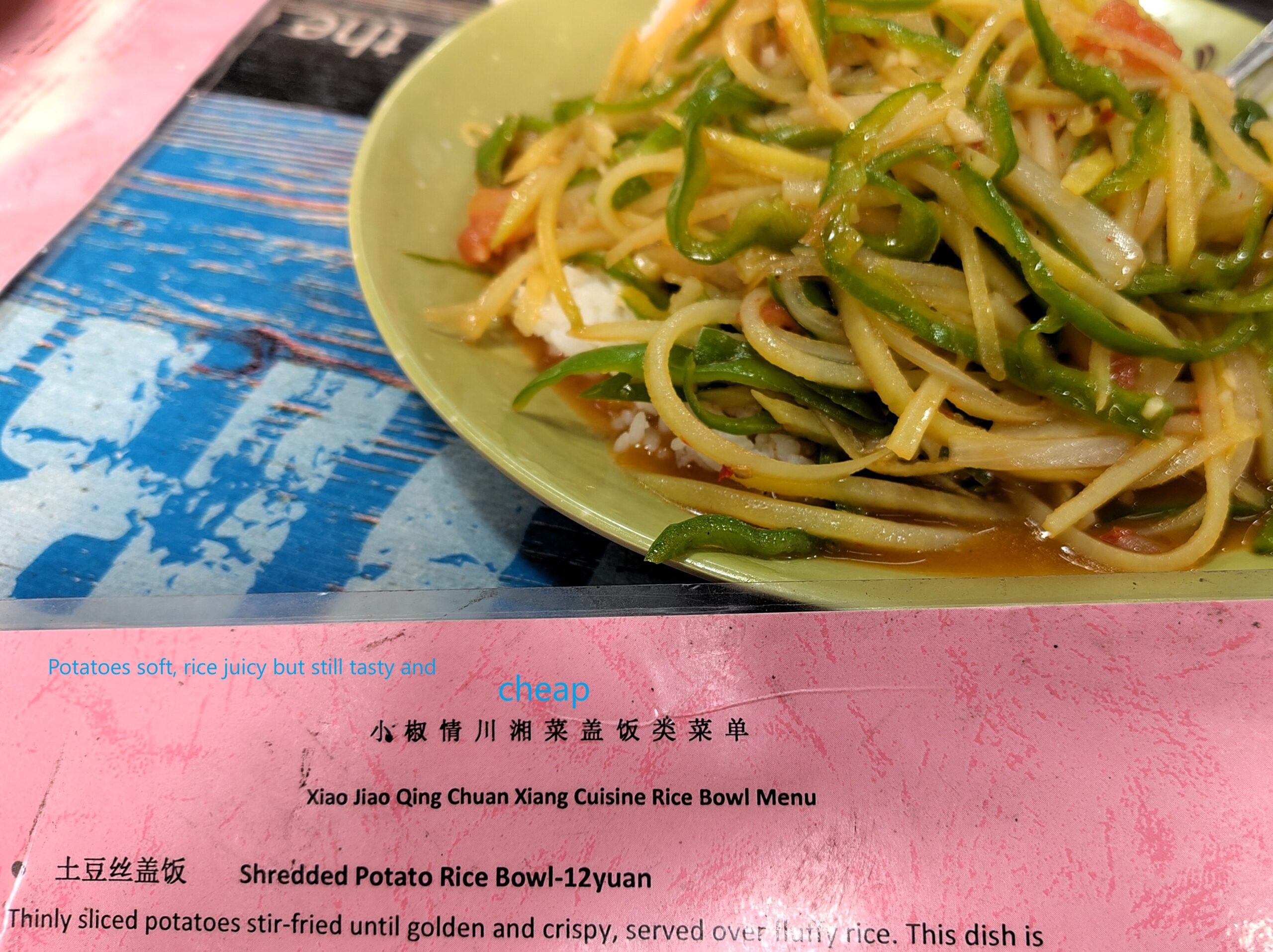 Then I went to a restaurant and ordered plain rice. The owner showed me to a table, poured me tea, and gave me a menu in English! There was something with rice and sliced potatoes, so I thought I could stay to eat (I had brought a takeaway box) since he was so accommodating. Then he brought a large plate full of rice, sliced potatoes, some vegetables, and… it was a bit spicy. With plenty of tea, it was manageable for me, but my strategy of a cleaning day was slightly changed. I needed two bananas to soothe my lips, and then there was no space left for the carrots.