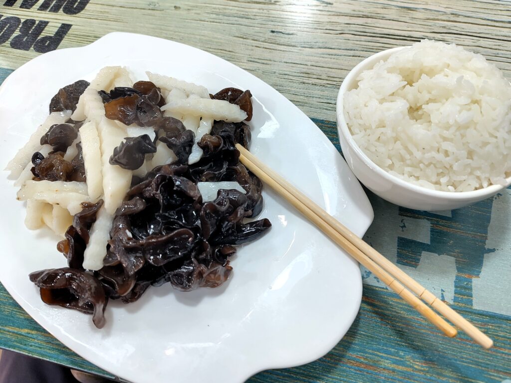I might have stayed at the hostel until I had to get to the station, but now I was too excited, said goodbye to everyone, and left. Outside, I went to the same restaurant as yesterday and ordered yam with mushrooms and rice. I ate very slowly, firstly because of my stomach and secondly because I had more than enough time. The side effect was that I felt full after eating halfway through. I learned this lesson on the container ships (and didn’t forget it, but rarely put it into practice), where I also ate meditatively, always putting my cutlery aside while chewing thoroughly.