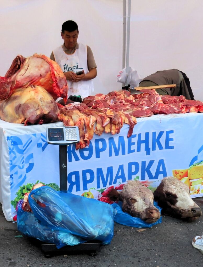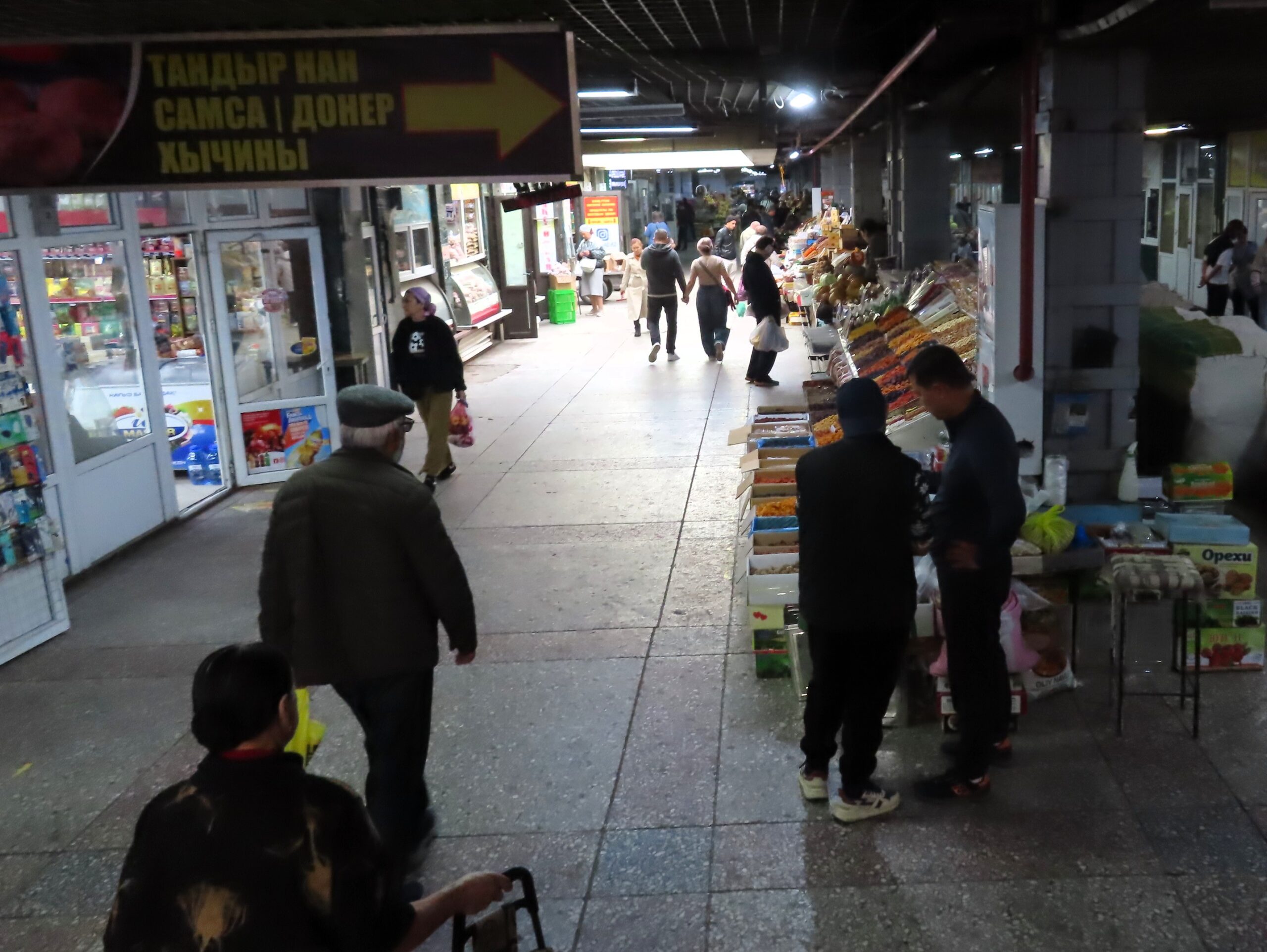 I continued south, past the university with its incredible view of the Ile Alatau Mountains and the Opera House. After a few more sightseeing tours, I went to the Green Market. On the way, I passed a street with several ATMs. The first one didn’t have any money, the second and third required an app installation, but the next one simply gave me money, and several more followed.