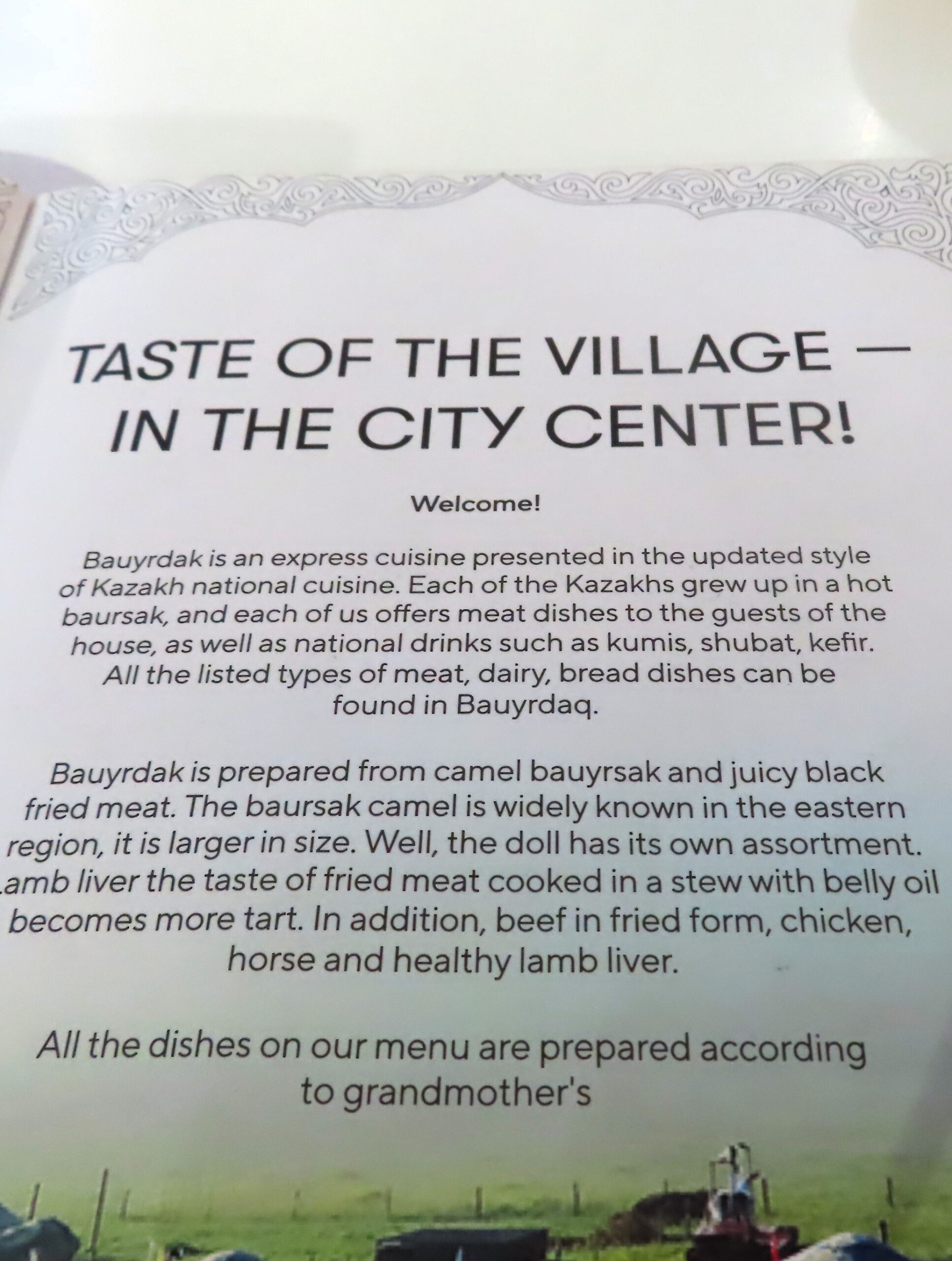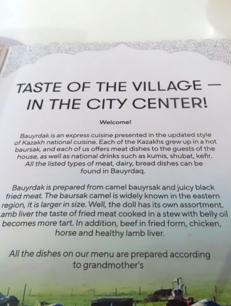 Then I went to the (fast-food) restaurant Bauyrdaq Aruzhan had recommended. I already knew that vegetarian food was almost never an option, and now it definitely wasn’t there. So I got liver instead of other meat, hoping that it was a byproduct and not the primary reason for killing a sheep. But ultimately, that’s just an excuse.